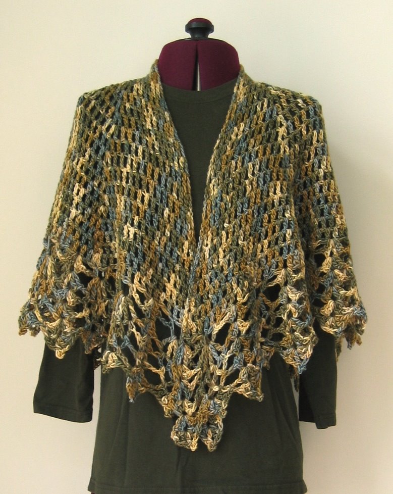 Make a medium length, fuller version of the basic All Shaw by: Fsc 9, with 9 Vβs in Row 1 (18 sts), work mesh body to 20 rows total (170 sts). Continue with lace trim, making 21 lace pattern repeats.