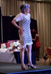 Hey, don’t be shy about entering and modeling your own crochet (or knit) stuff in these shows, really. It’s possibly even more fun in back than out front. And the audience is mighty generous with approval and applause. Unlike some of us who can’t say no, you will not have to wear anything that is too revealing unless you want to.