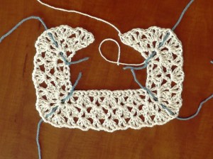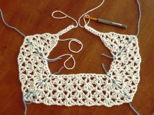 In the following row (not shown, because I do have a life), you will fill in the front neck foundations with some stitch pattern, in this case V’s and Shells. You now have the start of a round-neck cardigan yoke that is lower in the front neck, with right-hand and left-hand edges that can meet at the center front. It all looks wonky right now, but trust me. Once you finish that neck edge with some stitches or trim it will be beautifully and symmetrically rounded.