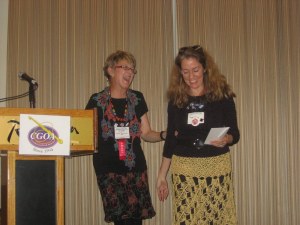 “Unsung Hero Award” — Diane Moyer.  You might not recognize her name or know her face, but Diane was the busiest posse member on site.  She appeared at several major events throughout the conference, quietly and competently working her assigned tasks.  BRAVA!