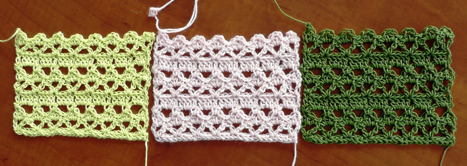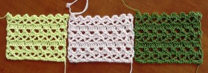 Imagine my dismay when none of my intended swaps would work to gauge, partly due to the fact that wool and animal fiber yarns have some give or stretch, whereas cotton and other plant fibers have none. Also, most animal fibers have some surface texture and stick-to-itself qualities that many plant fibers do not. Whatever the reasons, I found I could get the cotton/plant yarn swatches to match either stitch gauge or row gauge but not both.  I switched hook sizes.  I switched hook styles.  I wound and rewound balls in case the tension off the skeins was making any difference.  I cursed, I prayed. I did everything except crochet standing on my head and still I could not get any of the non-wool, warm weather choices to match my own gauge.