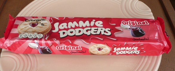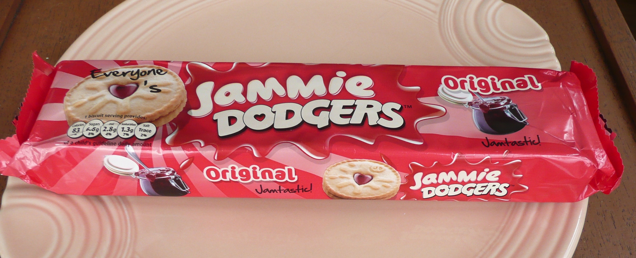 A typical English after-school tea time treat, these biscuits (cookies) are ubiquitous, sold in any corner grocery, one package containing 8 cookies costs one pound nine (around $1.70).    They remind me of Pepperidge Farm Verona cookies (the little rounds with fruit filling), except not as delicate and certainly not in the same way marketed to adult tastes.  Or maybe thumbprint cookies, but not. Jammie Dodgers are crisp rounds of shortbread cookie with a gummy sort of  filling sandwiched between.  The jammy part tastes of raspberry, but it’s a mix of flavors really.  It’s the sort of food nobody admits to eating or liking (much as Pop-Tarts are viewed here), and yet somebody is enjoying them because they are everywhere.  Not a sophisticated sweet by any means.  Yet strangely compelling.  A perfect match for hot, strong tea. I took away two packages but polished off a whole one during the endlessly boring flight back to Philadelphia.  Now that I’ve done the show and tell, I can eat this one, too! 🙂