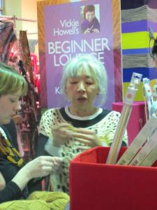 I am so sorry I did not record nor do I recall the name of my wonderful student here.  If you recognize yourself, please make a comment below and I will make it right! The lounge was well attended throughout the two day event and Vickie, a team of Vogue Knitting Live event volunteer teachers and I were kept pretty busy dispensing guidance and praise. It pleasantly surprised the students that the Tulip Etimo crochet hooks (or Tulip bamboo knitting needles) that we used for the lessons were theirs to take home along with their practice skein of Vic’s yarn, Sheepish.  Thanks to Caron for the tools, yarn and for sponsoring such a successful Beginner Lounge.