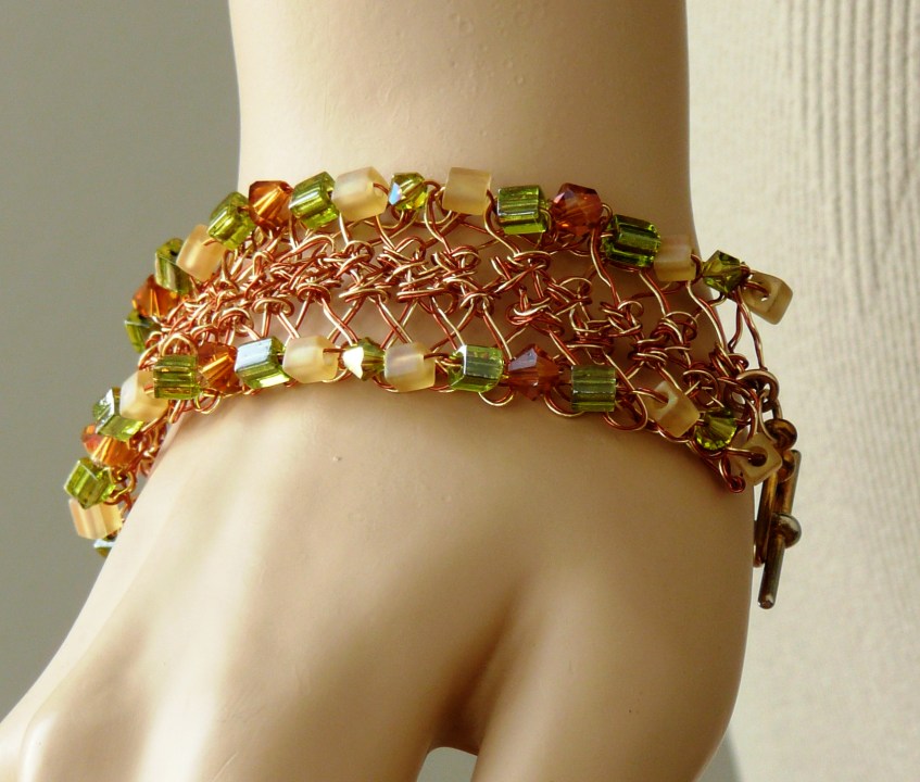 14 Hairpin Lace Bracelet Published June 28, 2012 at 1703 × 1446 in CGOA 2012 Crochet Design Competition Results Winner $100 Third Prize, Small Wonders/Jewelry category, sponsored by Boye and the Crochet Dude brand of tools and accessories. Designed by Jean DeMouy: Silverplated wire with Swarovski crystals and square seed beads, toggle clasp.