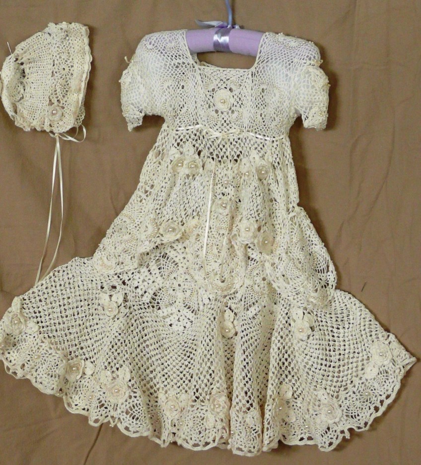 Designed by Carol Booth: Thread crochet christening outfit, made with #30 6-cord vintage Cartier-Bresson thread and a #10 steel hook. I crocheted a variety of different pineapple motifs, roses and Swarvoski crystal beads together to create this dress, with picot arch stitches. A lot of fun to create, just letting my fingers do the work!