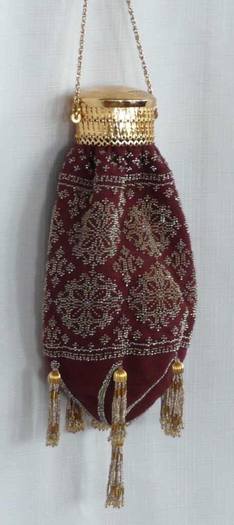 Designed by Kathryn White: This gatetop purse is done with vintage size 40 thread in a lovely brown. This purse features a design that is created by the beads crocheted into the piece. I used size 13 gold sead bead for this . It has golden beaded tassels for accent and a chain handle. The purse is lined with a satin like material. This piece is reminds me the the simple elegance of days gone by. The design really sparkles when the light catches it.