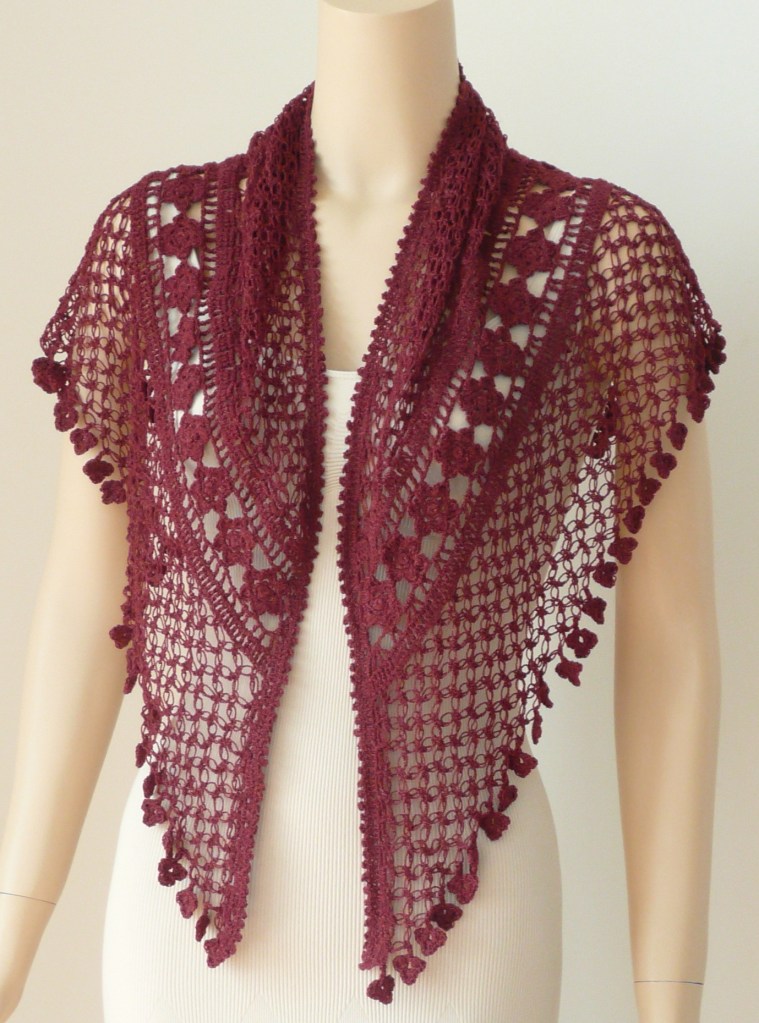 Designed by Kathryn White: This is a light and lacey shawl done in Estillo Tamm yarn in a burgundy color. The design features lovers knots surrounding a rose accent. The edging is a clover dangle to finish the piece. This light weight shawl is prefect to dress up anything you wear it with.