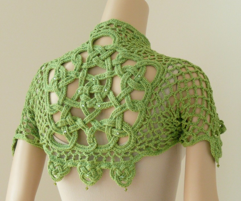 Designed by Jennifer Ryan: The highlight of this design is the intricate decorative knot on the back. A fine yarn made of nylon and acrylic fibers was used to create a “crocheted-cord”. After this cord was carefully woven into the knot, it was then embellished with crochet stitches to transform it into the shrug shape. Other knots were added as trim along the back, sleeve and upper edges. Glass beads and crystal gems were also added as a finishing touch of sparkle.