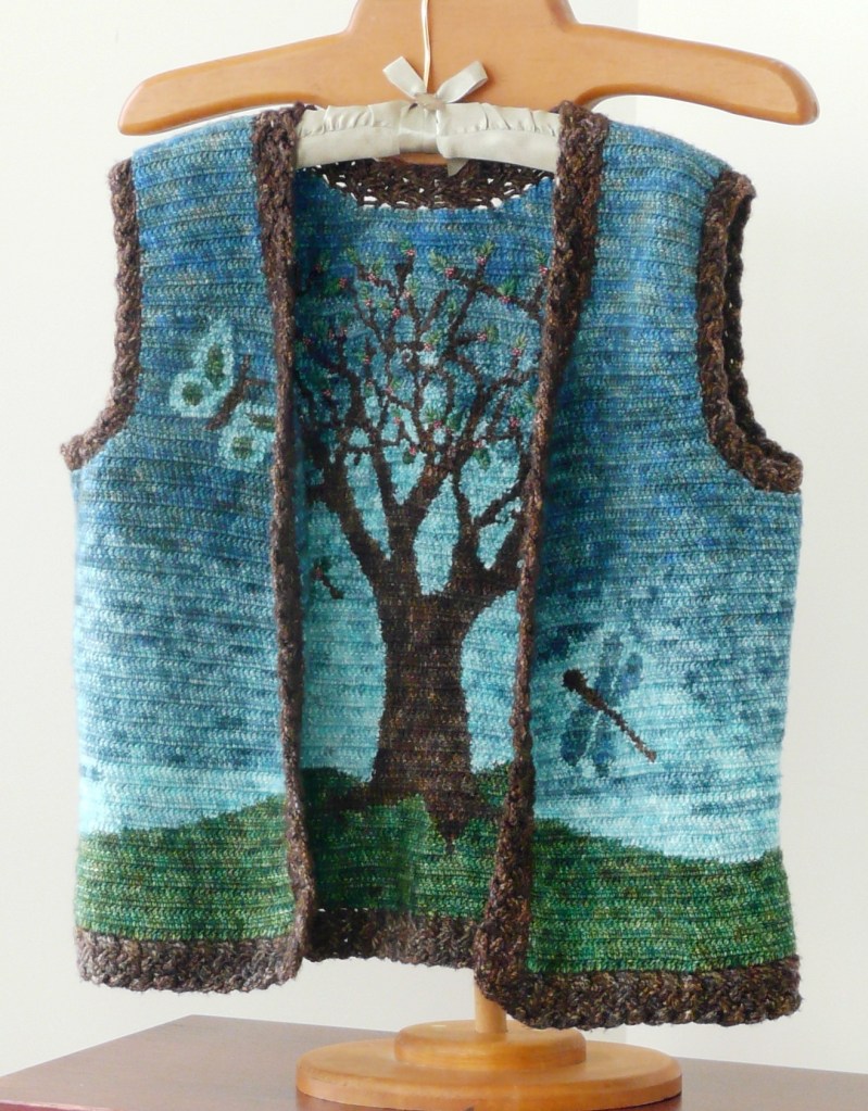Designed by Laurinda Reddig: Vest created using my own intarsia and cable techniques that produce a completely reversible fabric, the same on both sides. Worked entirely in double crochet, using hand-dyed Madelinetosh DK and a size C hook. Leaves were embroidered later through both sides of the work. The beading make the two sides of the tree different, with tiny red berries on one side and crystal flowers on the other. Designed in memory of my daughter Rowan, the butterfly and dragonfly on the front represent both my daughters.