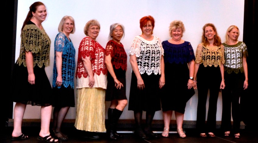 On the runway, CGOA Reno 2012: modeling Cat’s Cradle.v2, Linda Dean, Andee Graves, Janet Bates, Doris Chan, Tammy Hildebrand, Jenny King, Vashti Braha, Ellen Gormley