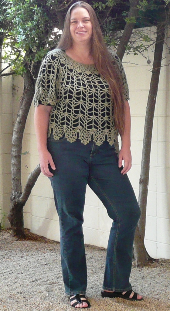 Linda in Size 3 full Published October 1, 2012 at 560 × 1024 in Cat’s Out of the Crochet Bag Linda Dean wearing Cat’s Cradle Size 3 standard length, CGOA Reno September 2012