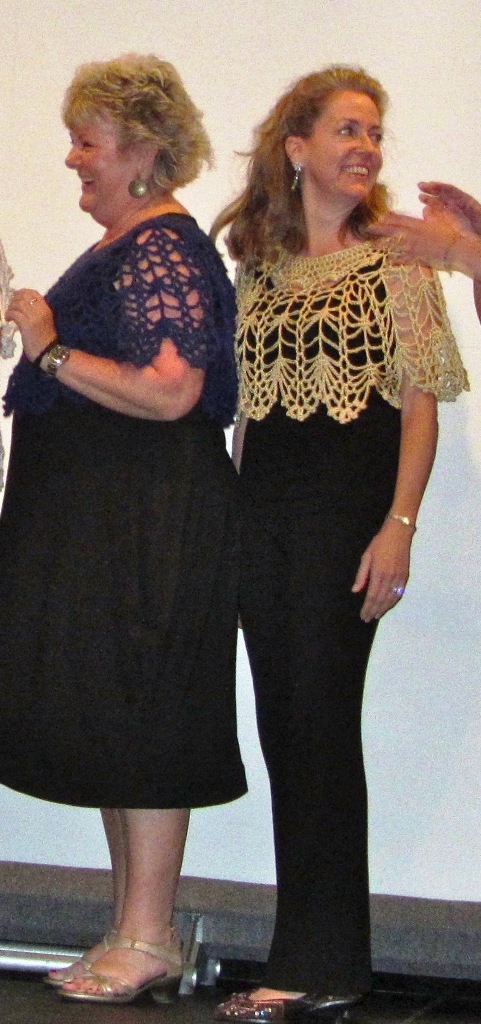 Shrugs in Reno sm Published October 1, 2012 at 481 × 1024 in Cat’s Out of the Crochet Bag Jenny King and Vashti Braha modeling Cat’s Cradle.v2 shrugs on the runway, CGOA Reno September 2012