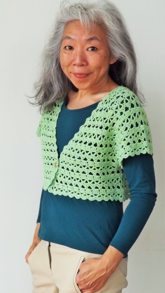 Bolero M Published May 30, 2014 at 1503 × 2676 in Introducing DJC Lotus Bolero: Crochet Conference Ready DJC Lotus Bolero 38/M DJC Lotus Bolero, in Lotus Bamboo Green, size 38/M w/ button stud