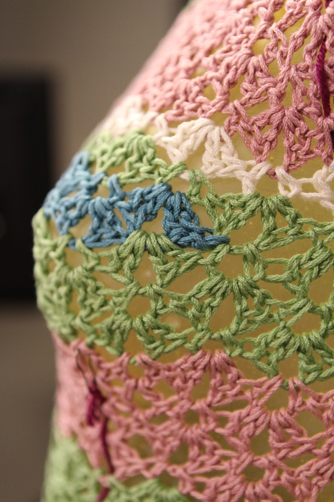 Construction Sample 3 Published May 14, 2013 at 683 × 1024 in Construction Sample 3 Bust Shaping, from Top Down Seamless Crochet DVD Workshop (Interweave Press, May 2013), with Doris Chan.