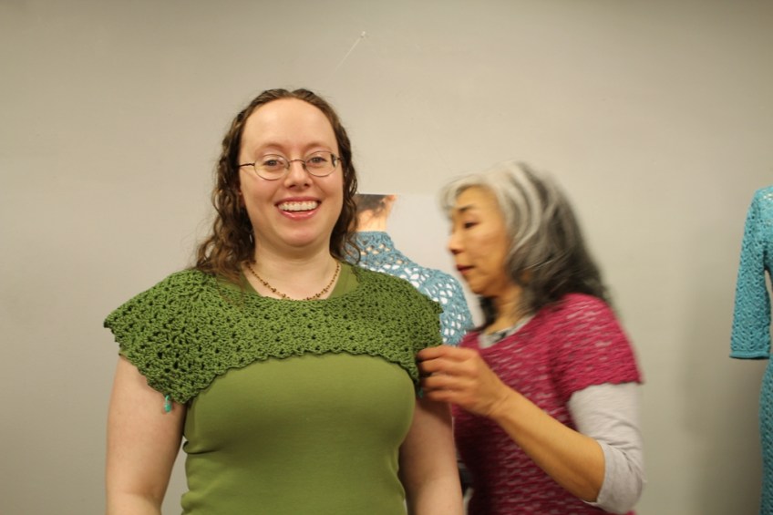 Fitting Sarah 1 Published May 14, 2013 at 1024 × 683 in Fitting Sarah 1 Fitting on model, Sarah Read, from Top Down Seamless Crochet DVD Workshop (Interweave Press, May 2013), with Doris Chan.