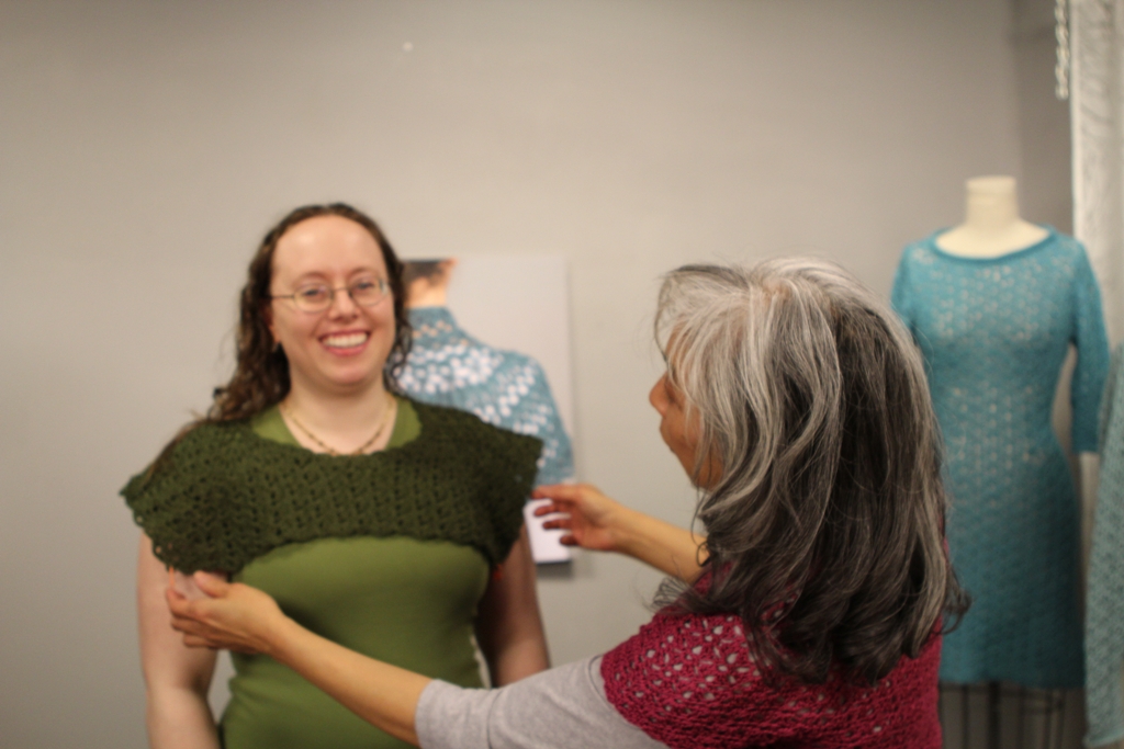 Fitting Sarah 2 Published May 14, 2013 at 1024 × 683 in Fitting Sarah 2 Fitting on model, Sarah Read, from Top Down Seamless Crochet DVD Workshop (Interweave Press, May 2013), with Doris Chan.