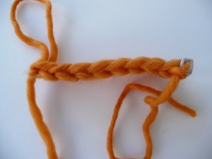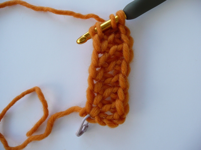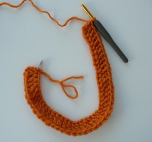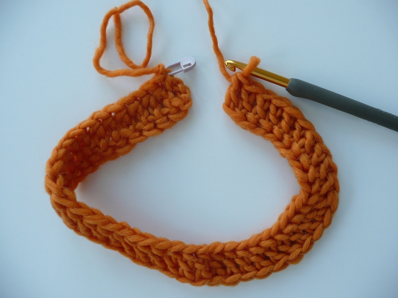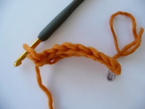 TUTORIAL 4 — Here’s a reduced sample of your strip just as you’re done crocheting. See the marker in the first chain made, see the next 3 beginning chains.