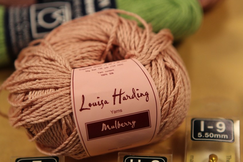 Sample Yarns 2 Published May 14, 2013 at 1024 × 683 in Sample Yarns 2 Doris’ Kolika t-shirt yarn, Louisa Harding Mulberry silk, from Top Down Seamless Crochet DVD Workshop (Interweave Press, May 2013), with Doris Chan.